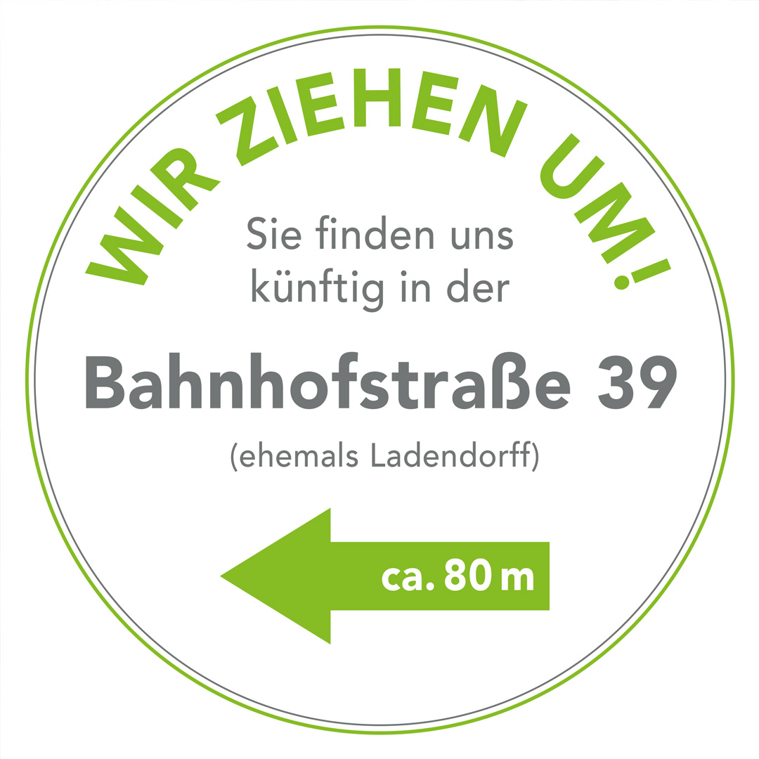Unsere neuen Geschäftsräume in der Bahnhofstraße 39 haben wir im November 2023 eröffnet. Wir sind montags bis freitags von 8:30 bis 18:00 Uhr und samtags von 8:30 bis 13:00 Uhr für Sie und Euch da!